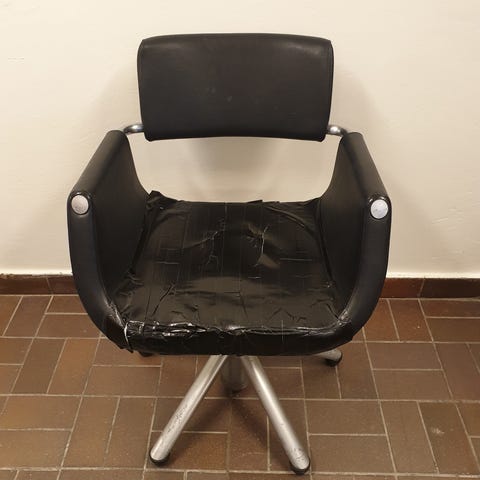 Stolen är tydligt sliten i klädseln (se bilder), främst på armstöd och rygg, men fullt brukbar. Perfekt för hemmabruk, garage, hobby, studio eller någon som vill klä om den.