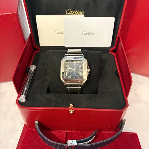 Klockan levereras med samtliga boxar, digitalt certifikat, manualer samt blått original läderband.