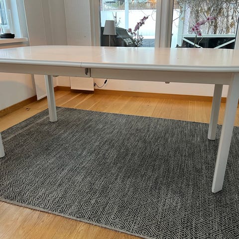 Vitt matbord och 4 stolar i mycket bra skick, inköpt på Mio. Tyvärr tuggade vår hundvalp på ett av stolsbenen som syns på bilden, men fungerar trots det. Själva stolen är i plast med sittdyna i skinn.
