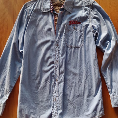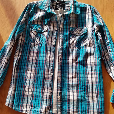 2. Blå flanell skjorta stl. 170, ett par grå mysbyxor stl. 170 och ett par grå mysbyxor stl. 170 med svarta sidfickor. 60kr.