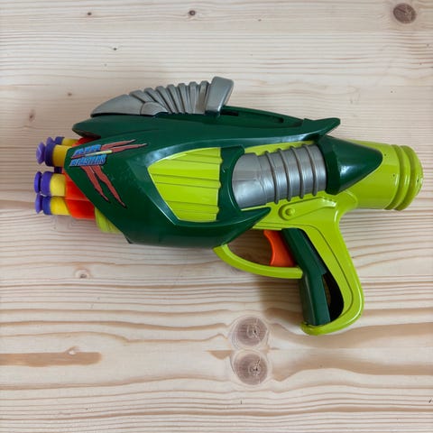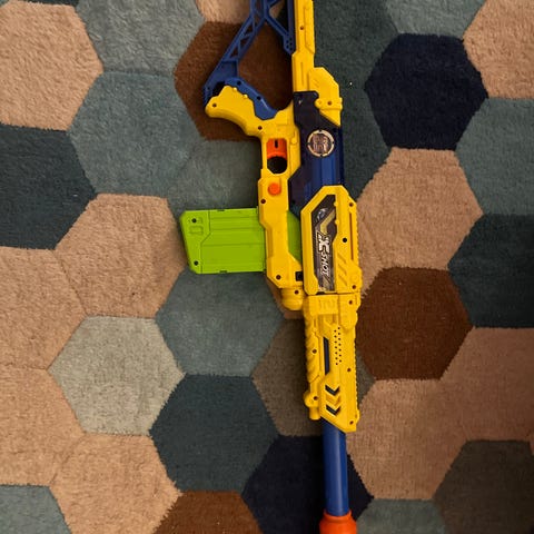 Ett leksaksgevär med semi action och pump action. Magasinet har två sidor så man kan ladda det med två uppsättningar med gummiringar (ammunition)