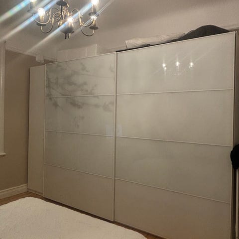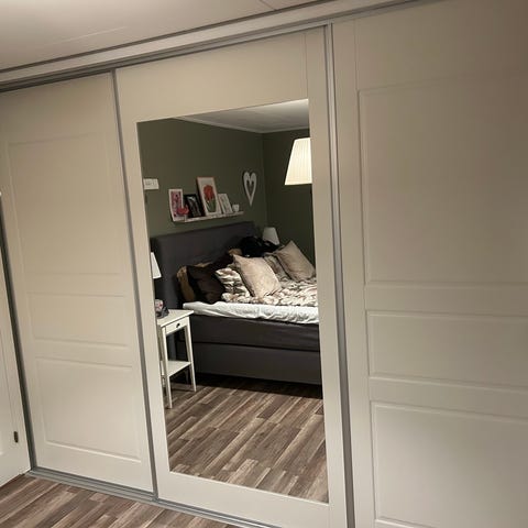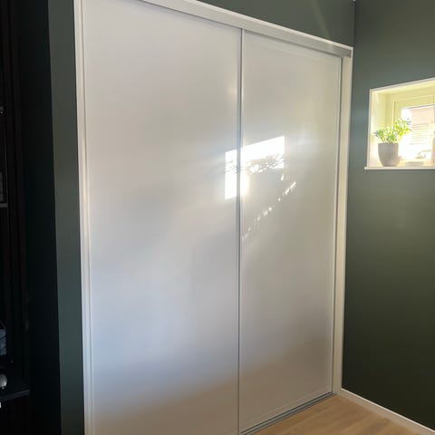 En ram PAX till skjutdörrpar med skena, vit, 200x201 cm (nypris 2495kr ) med paneler TJÖRHOM i matt vit, nypris 2000kr.