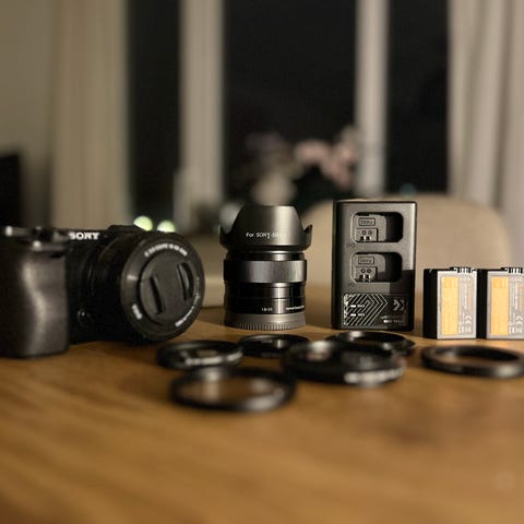 Sony Alpha 6000 systemkamera inklusive 16-50 mm objektiv. Levereras med kameraväska, 2x batterier, laddare och extra tillbehör som filter och objektivlock.