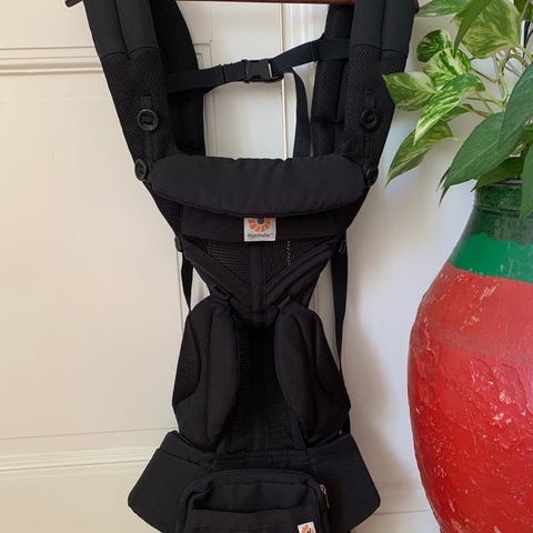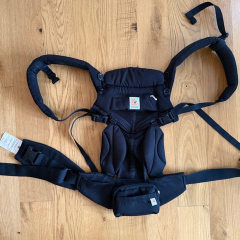 Ergobaby bärsele i svart färg. Designad för att bära barn bekvämt och ergonomiskt. Justerbara remmar och vadderade axelband för stöd och komfort. Materialet är mjukt och slitstarkt.