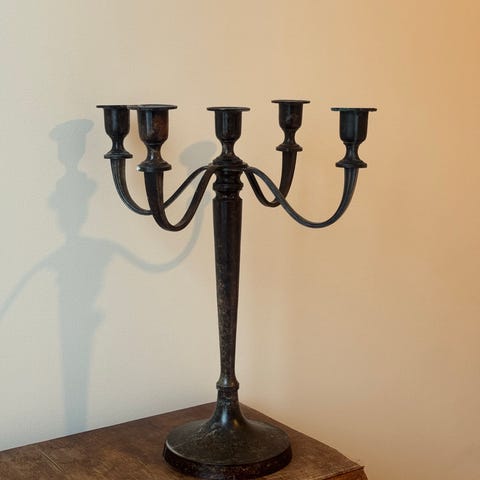 Paret otroligt vackra antika franska kandelabrar/kyrkoljusstakar. Foten är i gjutjärn. Bronserade. Plats för fyra ljus i varje stake. Mycket fint skick enligt bilder.