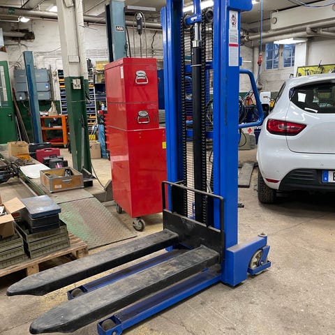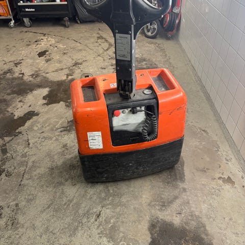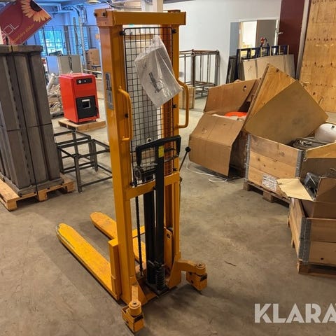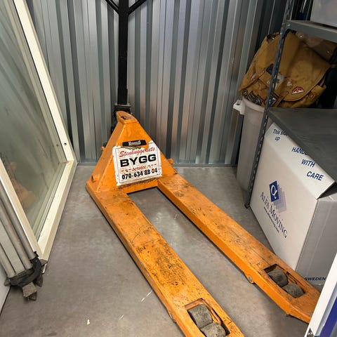 Pallyftare handtruck i orange färg med två gafflar och hjul för enkel förflyttning av pallar och tunga laster. Verktyget är utformat för att användas manuellt vid lyft och transport inom lager och industri.