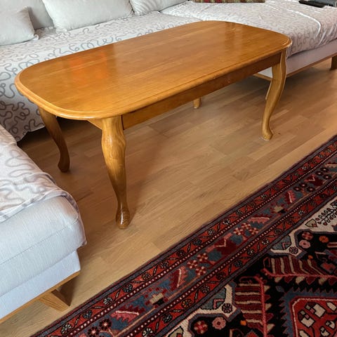 Bord i ljust trä med rektangulär form och en underhylla för extra förvaring. Passar som soffbord eller avlastningsbord i vardagsrum eller liknande utrymmen.