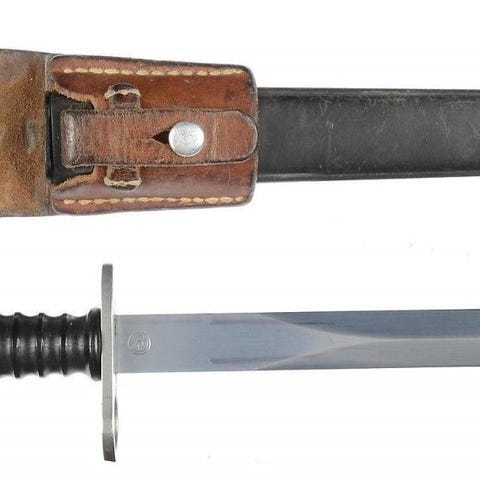 Bajonett i metall med handtag och klinga. Tror det är till Carl Gustav numrerad D 151 I 21 väldigt fin