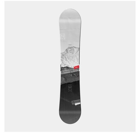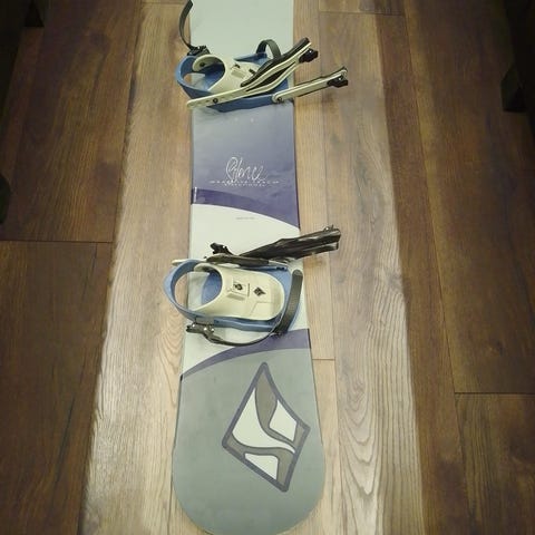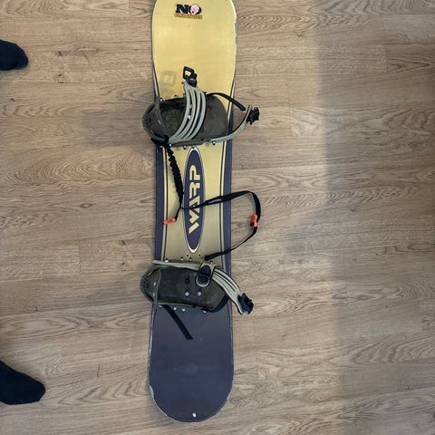 Nitro snowboard med flowbindningar i färgerna gul och svart. Snowboarden är avsedd för vintersport och har en design som inkluderar svarta ränder och en gul bas. Bindningarna är monterade och anpassade för att fästa snowboardboots genom att man öppnar bak och skjuter in foten för att sedan knäppa upp där bak från hälen, snabbt och smidigt. Ca 155 cm