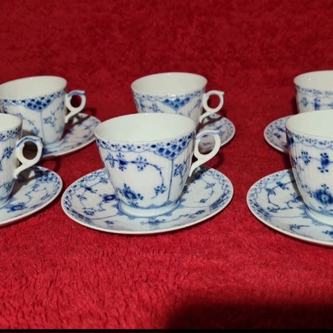 6 Kaffekoppar 1549 med fat 6 assietter 1625