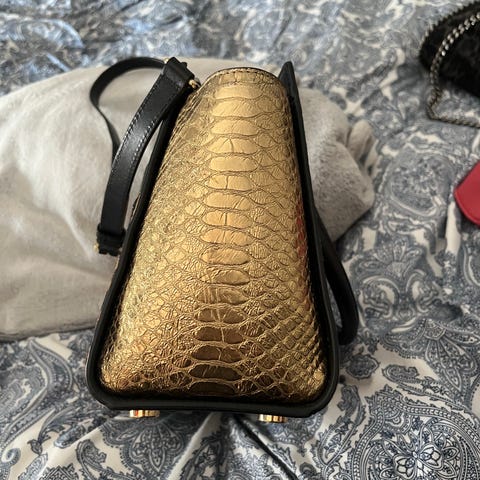 Michael Kors väska i läder. Väskan har en limegrön färg med krokodilmönster och ett kedjehandtag med metalldetaljer. Invändigt fodrad med mönstrat tyg och logotyp. Passar för vardagligt bruk eller tillfällen där en mindre väska önskas.