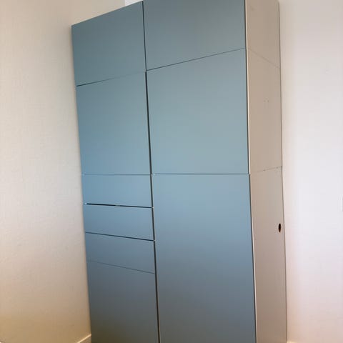 Vill man ha dörrar till kan man köpa det på IKEA för ca 150-200 kr. Man får med 2 extra knoppar till två dörrar om man väljer att ha det. Vi valde att ta bort dörrarna.