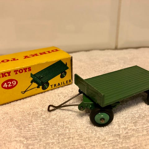 Två leksaker i orange färg bestående av en traktor och en gaffeltruck. Leksakerna är tillverkade metall o från 50-60 talet . Märke dinky toys made in England.