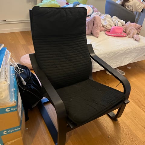 Denna färgglada fåtölj var inköpt våren 2025. Vi tänkte den skulle vara underbart att vagga våran kommande bebis. Tyvärr har lille Felix helt andra planer och fåtöljen agera numera som hylla där man kan lägga filtar eller gosedjur när man ska dammsuga.