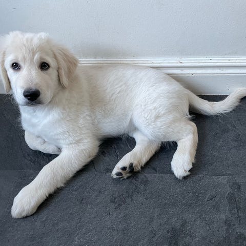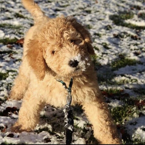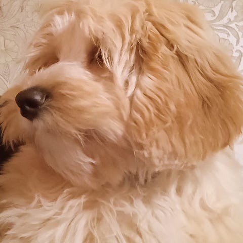 Pappa labradoodle mamma liten labrador blandning med inslag av tibetansk spaniel.