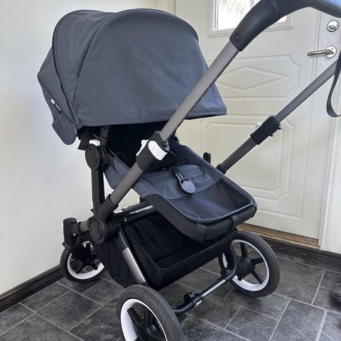 Bugaboo donkey 5 mono barnvagn med grå och rosa detaljer. Inkluderar sittdel, liggdel, bilbarnstol med adapter till vagnen, extra tillbehör som åkpåse och madrass. Passar för barn och är utformad för att ge komfort och säkerhet vid transport. Universell regnskydd följer med. Finns i Trollbäcken Tyresö