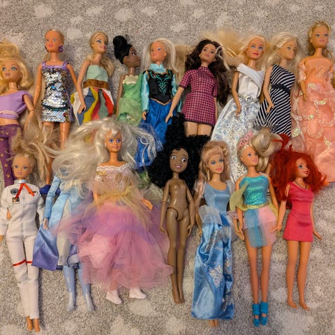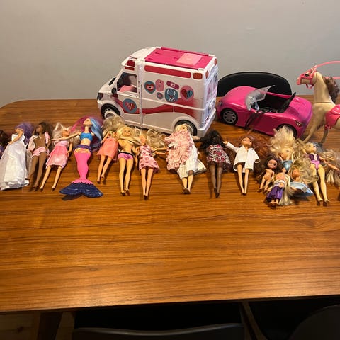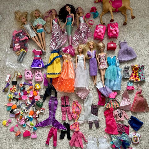Barbie dockor och tillbehör i ett paket med flera olika dockor och tillbehör. Innehåller olika modeller och kläder, lämpligt för barn.