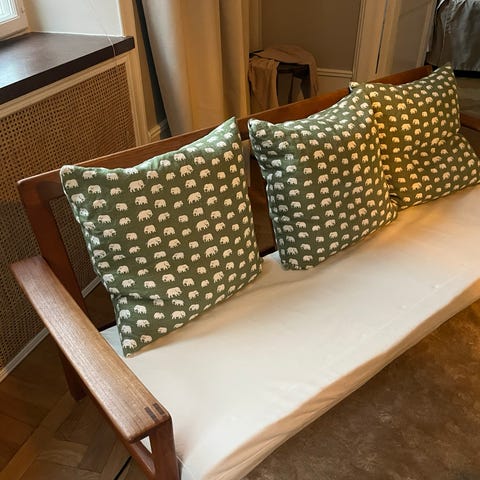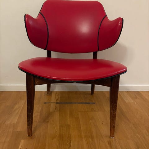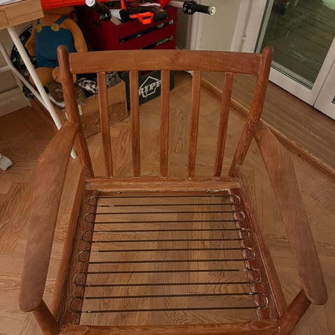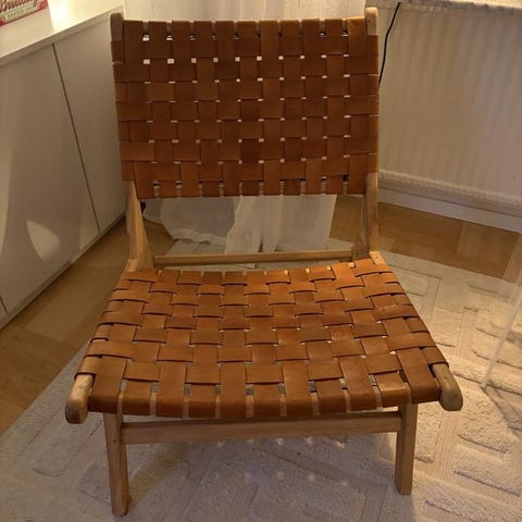 Till salu en snygg och mycket ovanlig gungstol från 1950/60-talet. Den kommer från Danmark men vet tyvärr inte tillverkaren. Materialet är massivt teak samt svart läder/skinn. Kudden är original, klädd med grönt ull. Storlek ungefär 80 x 108 x 60 cm. Den är i hyffsat bra skick med fin patina, några mindre märken och repor kan finnas. Lädret är i bra skick, med några tunnare krakyleringar på ytan bara. Går fint att använda som den är, kudden är enkel att klä om.