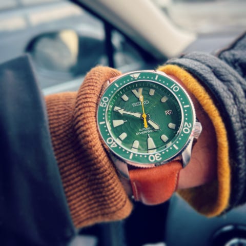 Seiko Prospex Alpinist med grön urtavla och brun läderrem. Klockan har en klassisk design med tydliga visare och datumvisning.