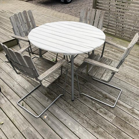 Utegruppen är i fint skick i helhet. Lite rost i bordets stativ.