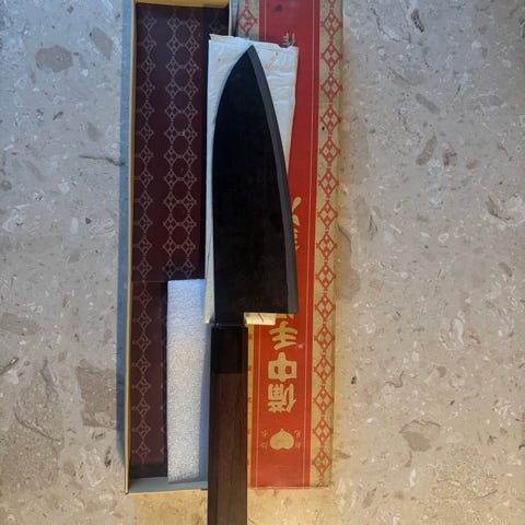 Blad i 65 lager Damaskusstål med hårt VG10-stål i kärnan och sidor i SUS-430- och SUS-431-stål. Stålets HRC ligger på 60-62. Handtag i svart Pakkaträ.