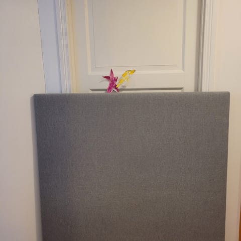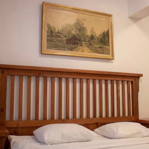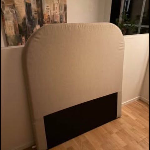 Hemmasnickrad sänggavel i trä till en 120cm bred säng. Ca 120cm bred & hög.