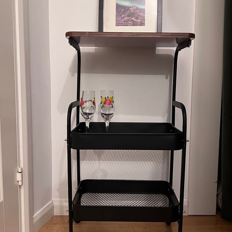 Säljer en exklusiv och stilren serveringsvagn/barvagn i guldfärgad metall med glasskivor. Väldigt elegant design som passar perfekt i salong, barbershop, lounge, vardagsrum eller kontor för en riktig bra pris