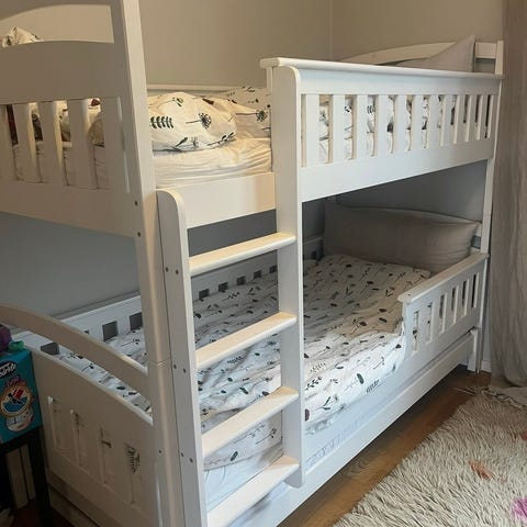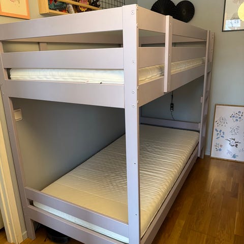 Ommålad våningssäng/familjesäng med två lådor som rymmer enormt mycket. Färg är avskavd på vissa ställen och det finns spår av klistermärken. Inget som stör funktionen och går att måla om ifall man vill.