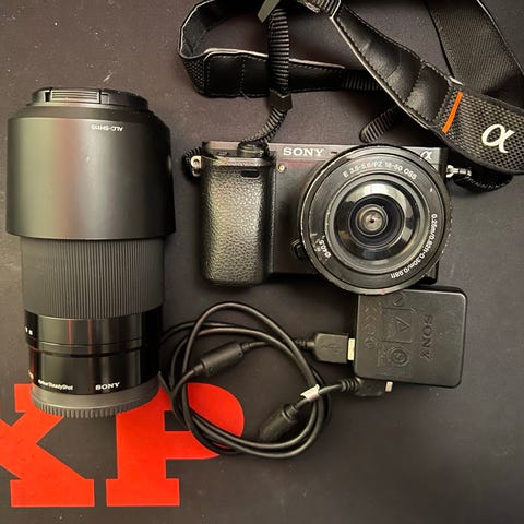A Sony Alpha 6000 camera, two lenses (16-50mm and 55-210mm, both with lens hoods), a 256GB memory card with adapter, a camera bag, and two lens pouches are included free of charge!