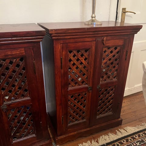 Två röda chinaskåp använt skick säljes för 1500kr/st. Vi har två stycken.