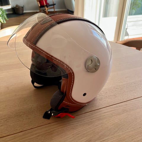 För moped entusiasten som vill klä sig som man gjorde på 40-talet. Säljer svarta läderhandskar, st 10, och läderhjälm med mjukt ljusfärgat foder. Handskarna har en längre design för extra skydd. Mössan är fodrad och har knappar för justering och fäste. Materialet är läder med ett varmt, mjukt innerfoder.
