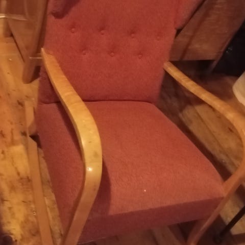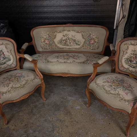 Soffa med blommönster i beige och grönt. Möjlig användning som vilstol eller extra sittplats. Passar för rum med träpanel och trägolv.