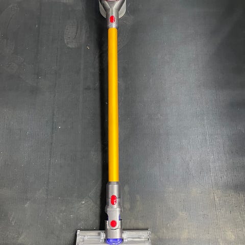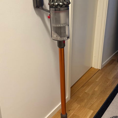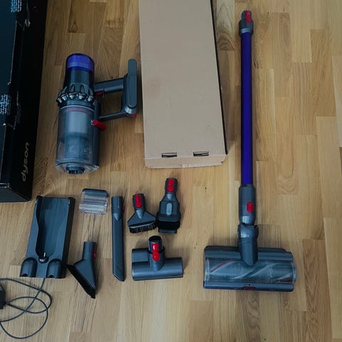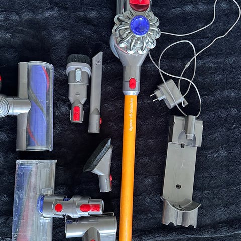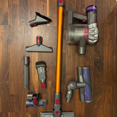 Dyson dammsugare med flera tillbehör inklusive olika munstycken och borstar. Produkten är lämplig för olika rengöringsbehov i hemmet.
