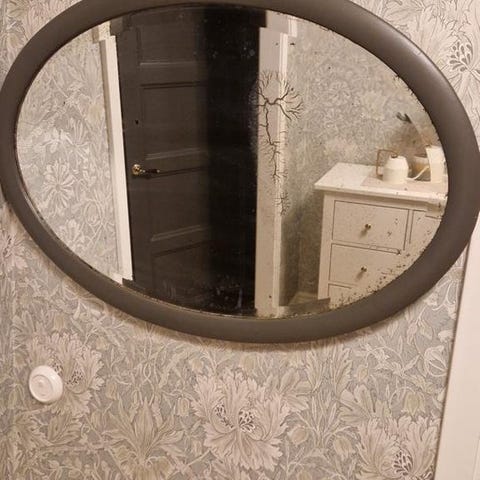 IKEA spegel med dekorativa ornament i ram. Spegeln har en klassisk design med detaljerade utsmyckningar som pryder ramen. Passar för användning i hemmet som en funktionell och dekorativ spegel.