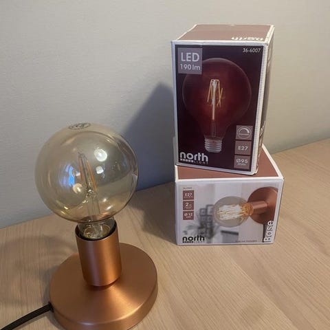 1. Cotton Blue Maison Styles bordslampa med svart metallgaller och rund bas. Lampan har en dekorativ glödlampa och är avsedd för inomhusbruk. Kabeln är svart och utrustad med strömbrytare.