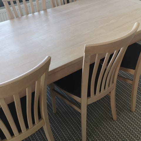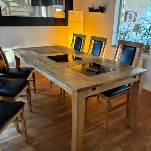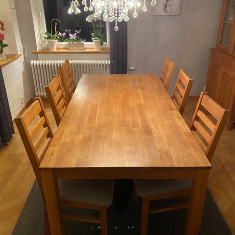 Matbord i oljad massiv ek med plats för många. L 240 B 100 H 74. + iläggsskiva 45x100.