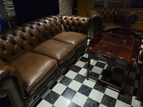 Två exklusiva Artwood Newport fåtöljer I brunt läder.