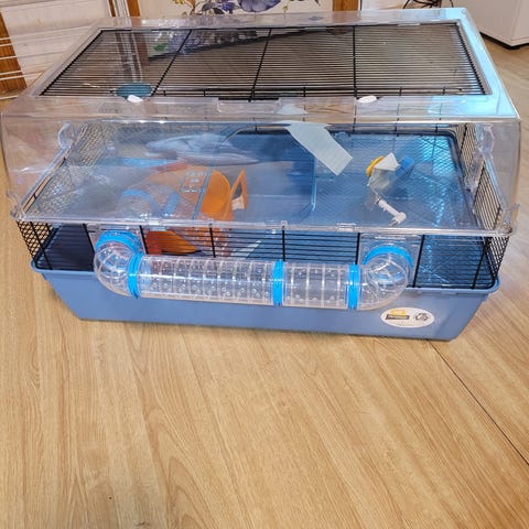 Bur till smådjur 115*60 cm. Med massa tillbehör. Följer även med ett hyllplan till.
