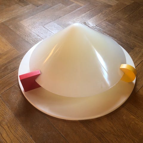 Klassisk memphis-inspirerad lampa från 80-talet. Överdel i lackerad metall, fästen i målat trä, kupa i plast.