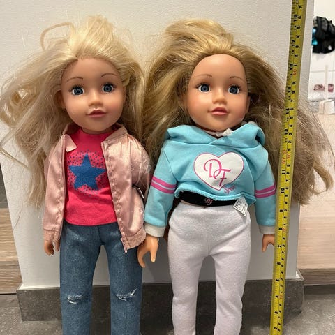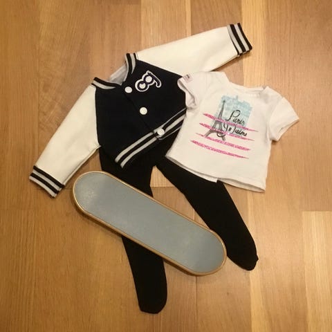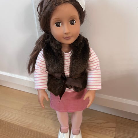 Modedocka, ca 46 cm av märket Our Generation säljes tillsammans med bl a flera kläder, 3 par skor, resväska med necessär, kam, biljetter och pass, kamera och handväska