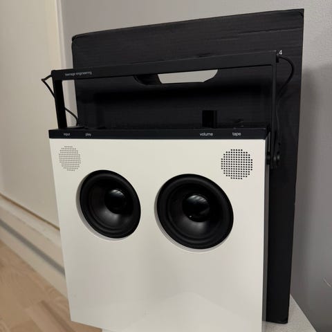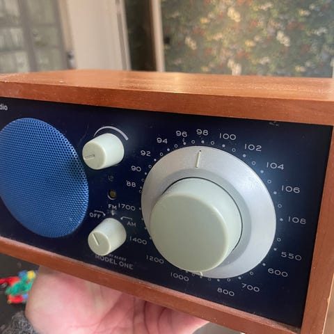 Henry Kloss Model One radio med FM och AM mottagning, extern antennanslutning, AUX-ingång och volymkontroll. Enhet i vitt utförande med analoga rattar för inställning av frekvens och volym.