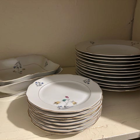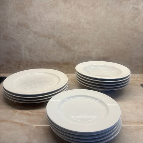 Tallrikar och skålar i vitt porslin från Ikea. Setet innehåller flera storlekar av tallrikar och skålar.