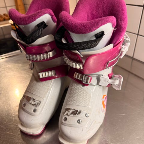 Tecno Pro T40 skidpjäxor för barn i svart med innermått 15,5 cm och yttermått 20,6cm, vilket motsvarar ungefär skostorlek 24,5 till 25 tror jag. Skidpjäxorna har funkat bra för vår dotter då hon var både 3 och 4 år. De är synligt använda men fullt fungerande.