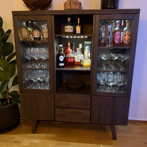 * Skåpet har en modern design med en genomskinlig sektion upptill för att t ex visa glas och flaskor.
