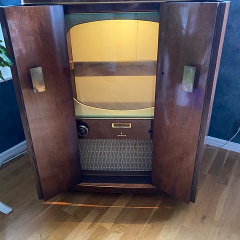 * Skåpet står på silverfärgade ben.