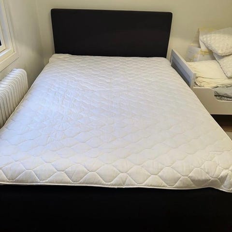 Mio säng och madrass med en ljus överdel och mörk kant. Storlek 140cm. HÄMTAS 4 FEBRUARI PGA FLYTT