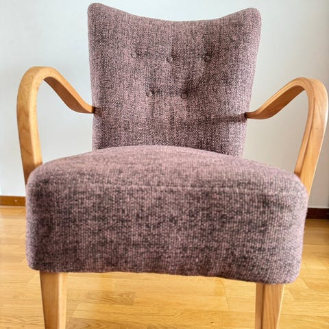 Säljer 50-tals fåtölj med omklädsel i mjukt teddy liknade tyg .Original trästomme i mycket gott skick. Nyligen omklädd, rök- och djurfritt hem. Mått och fler bilder kan skickas vid intresse. Inga skavanker alls hämtas på plats .