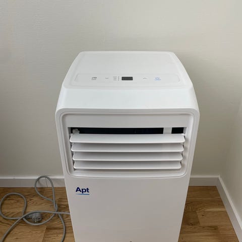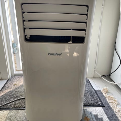 Comfee portabel luftkonditionering med kontrollpanel och kontroller för inställningar, vit färg och slang för luftutsläpp. Enheten har funktioner för avfuktning, fläkt och temperaturstyrning. Används för att kyla och ventilera mindre utrymmen.