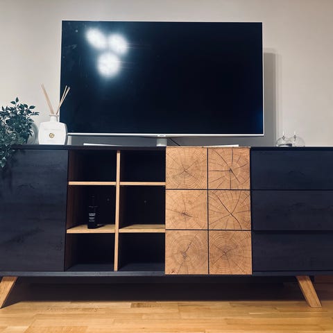 * Den specifika modellen är en svart TV-bänk som mäter 182 cm i bredd.