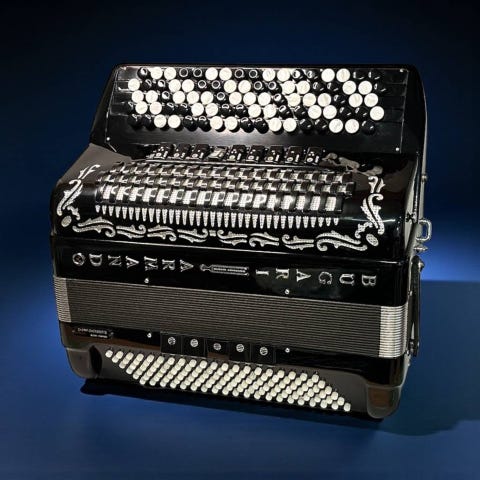 Bugari Armando dragspel i rött med knappar och bälten för handhållning. Instrumentet har ett klassiskt utseende med dekorativa detaljer och en vadderad baksida för komfort vid spelning. Fullt fungerande i ett väldigt bra skick.